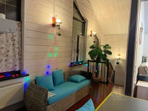 На 2 этаже зона отдыха, караоке, музыкальный центр, камин, детский уголок, настольные игры, умная колонка Алиса, также есть спальные места на 2 семьи с детьми.